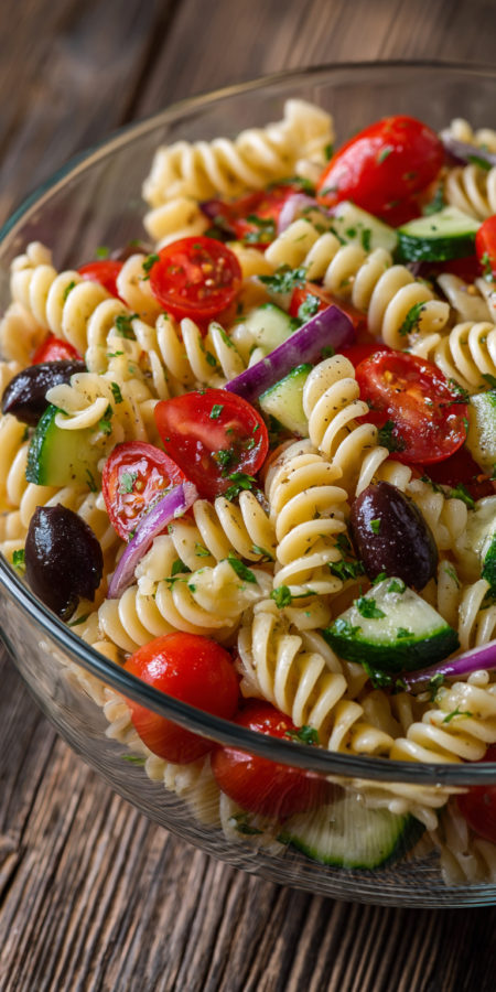 Swap the rotini for farfalle (bow-ties) or penne. Use pepperoni slices instead of olives for a meaty version. Try feta cheese instead of mozzarella for a tangy kick.