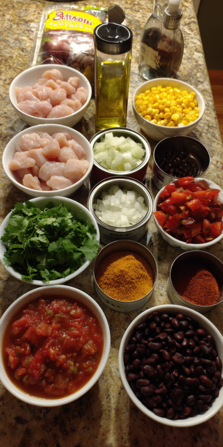 You’ll need 1 tablespoon of olive oil, 1 pound of boneless, skinless chicken breast or thighs, 1 packet of taco seasoning, 1 (15 oz) can of black beans (rinsed), 1 (15 oz) can of pinto beans (rinsed), 1 (15 oz) can of corn (drained), 1 (10 oz) can of diced tomatoes with green chiles (like Rotel), 1 (8 oz) can of tomato sauce, and 4 cups of chicken broth.