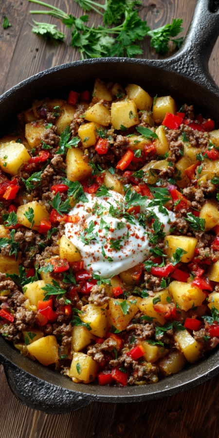 Everything cooks together in a single skillet. The beef browns, the potatoes get tender, and the flavors all mix in one place.